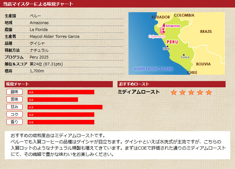 おすすめの焙煎度合はミディアムローストです。 ペルーでも入賞コーヒーの品種はゲイシャが目立ちます。ゲイシャといえば水洗式が主流ですが、こちらの入賞ロットのようなナチュラル精製も増えてきています。 まずはCOEで評価された通りのミディアムローストにて、その繊細で豊かな味わいをお楽しみください。