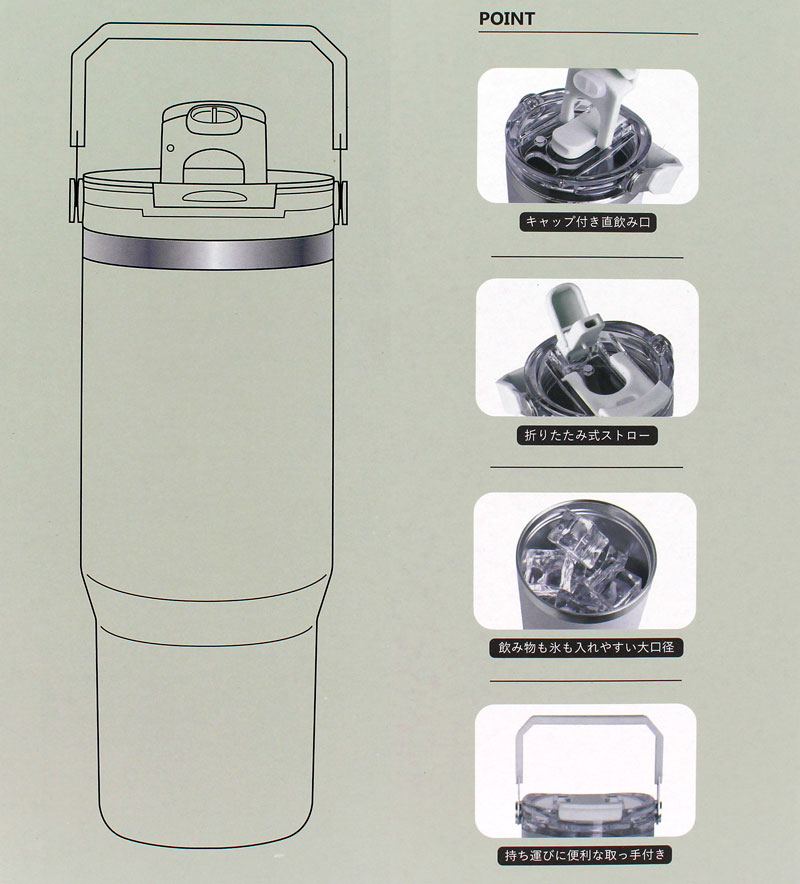 シリコンの飲み口(内部にはストロー付き)で、直飲みもできる2WAYタイプの大容量(900ml)タンブラーです。 もう一方の注ぎ口もしっかり閉じられるので、倒れても安心です。 ドリンクホルダー(直径約7.6cm以上に対応)にも入ります。 持ち運びに便利な持ち手付きで、フタはスクリュー式でしっかり閉じられるので安心です。
