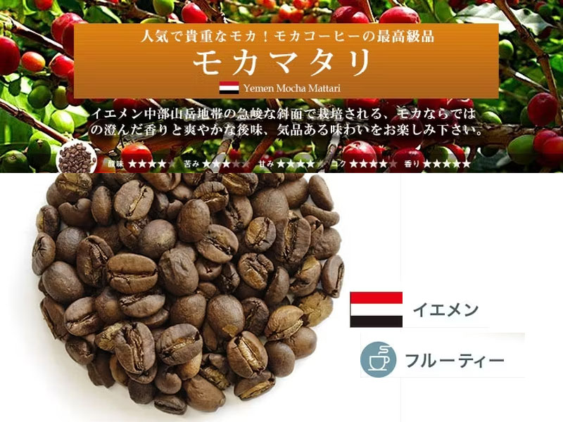 コーヒーといえば「モカ」といわれるほどモカコーヒーは世界中の多くの方に支持されている人気の銘柄。 独特の甘い澄んだ香りと爽やかな後味、気品のある味わいが多くの人々を魅了し続けています。