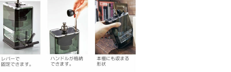 ハリオの本体横のレバーを倒すことで吸盤が、机などに固定できるクリアな文庫本サイズのコーヒーミルです。