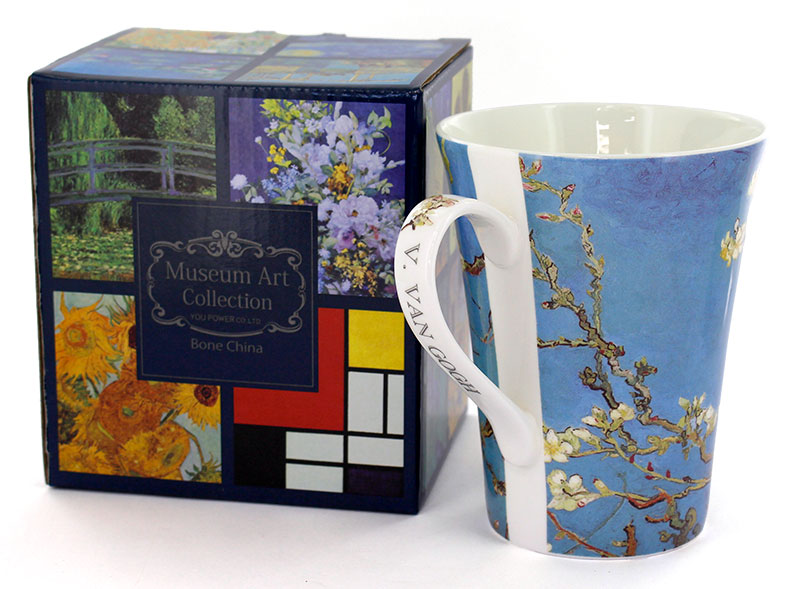 ゴッホやモネなど、名画の世界をそのまま閉じ込めたマグカップです。 持ち手の部分には絵画からのモチーフのワンポイントと作家名の英文字が入っています。