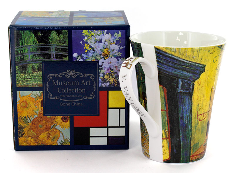 ゴッホやモネなど、名画の世界をそのまま閉じ込めたマグカップです。 持ち手の部分には絵画からのモチーフのワンポイントと作家名の英文字が入っています。