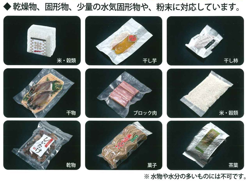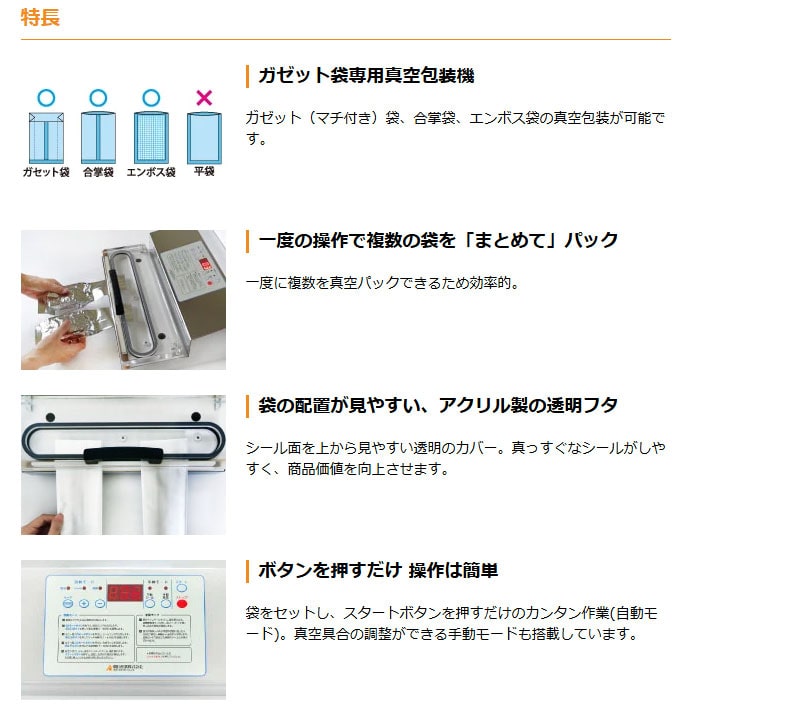 使用可能な袋:ナイロンガゼット袋、アルミガゼット袋、合掌袋、エンボス袋