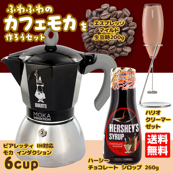 IHヒーター対応のビアレッティ モカインダクションと、 ハリオ クリーマーZ、チョコレートシロップ、深煎りのエスプレッソマイルドをセットにした、 いきなりカフェモカセットです。