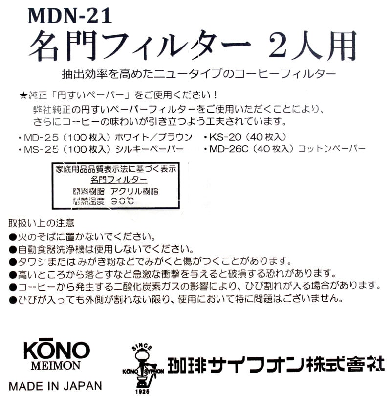 フィルターはコーノ 円錐 コーヒーペーパー 2人用 名門 MD-25 (100枚)、 もしくはコーノ 円錐コットンペーパー MD-26C (40枚入)をお使いください。
