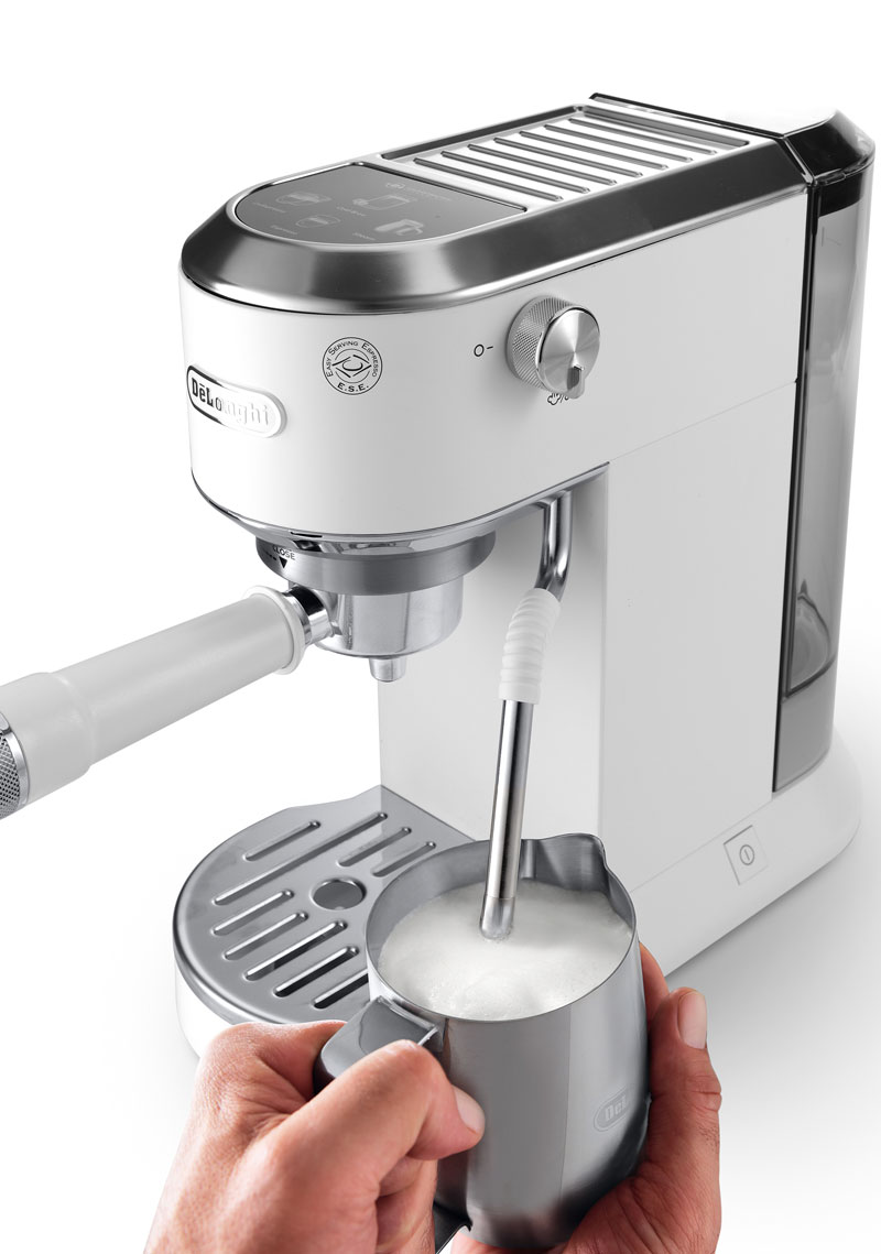 デロンギのスリムなポンプ式抽出のエスプレッソメーカー「デディカ デュオ」は、自分の手でお店のようなコーヒーを淹れる愉しみ、ラテアートを魅せる悦びをおうちで叶えるエスプレッソ・カプチーノメーカーです。 抽出やスチームを手動で調整できるため、エスプレッソはもちろん、ミルクの質感を自分好みに整えてカフェラテなどのミルクメニューを仕上げ、ラテアートまで愉しめるのが特長です。さらに、ホットだけでなく、コールドブリューまで選択肢も広がり、季節や気分に合わせた「バリスタ体験」を一年を通してお愉しみいただけます。