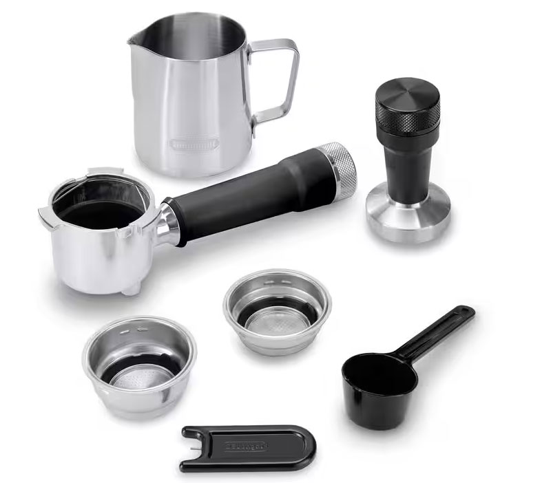 ミルクジャグ(ミルクピッチャー)とちゃんとしたタンパー(材質がステンレススチールなので、 適度な圧力でタンピングできます。)が付属品として同梱されており、エスプレッソもラテもすぐに自宅で楽しめます。