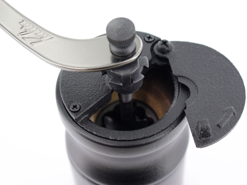 ホッパーのフタをスライドさせてコーヒー豆を投入します。ボディの下側を回転させるとコーヒー粉が取り出せます。フタつきなのでコーヒーを挽いている最中にグラついてもこぼれたりしないので安心です。