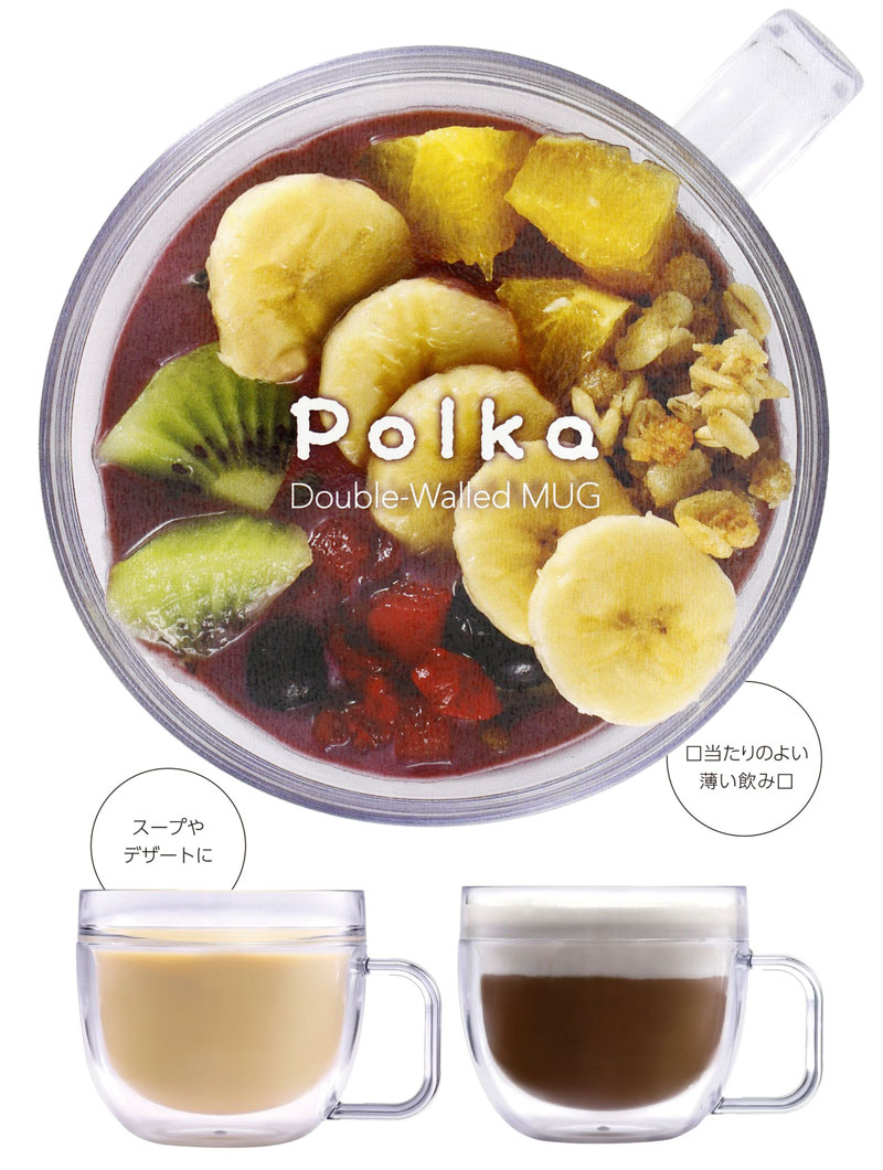 デスクワークやテレビのお供に、二重構造になっていて結露しにくいPolkaダブルウォールマグです。 AS樹脂製で、軽くて扱いやすく、割れにくいのもいいところ。 飲み口は薄く、口当たりが良くなっています。 クリア基調で、ドリンクやデザートを入れて、おしゃれに楽しめます。