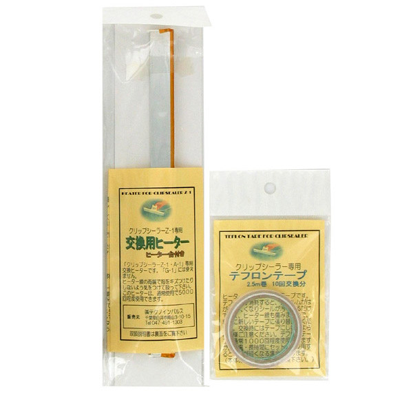 内容:クリップシーラー本体、消耗品の交換用ヒーター、テフロンテープ(10回分)、交換用フッ素樹脂テープ2本、取扱説明書