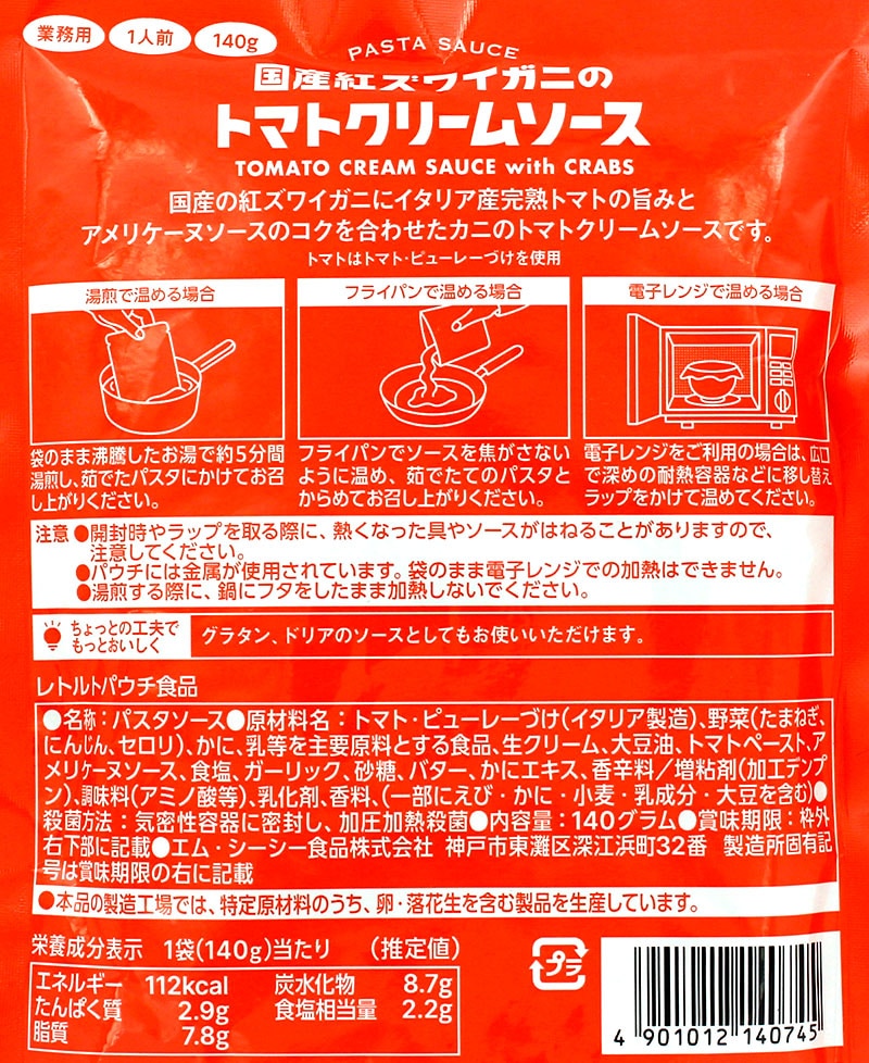 [セット] MCC 国産紅ズワイガニのトマトクリームソース 1人前 140g×30袋 エムシーシー 業務用パスタソース 送料無料