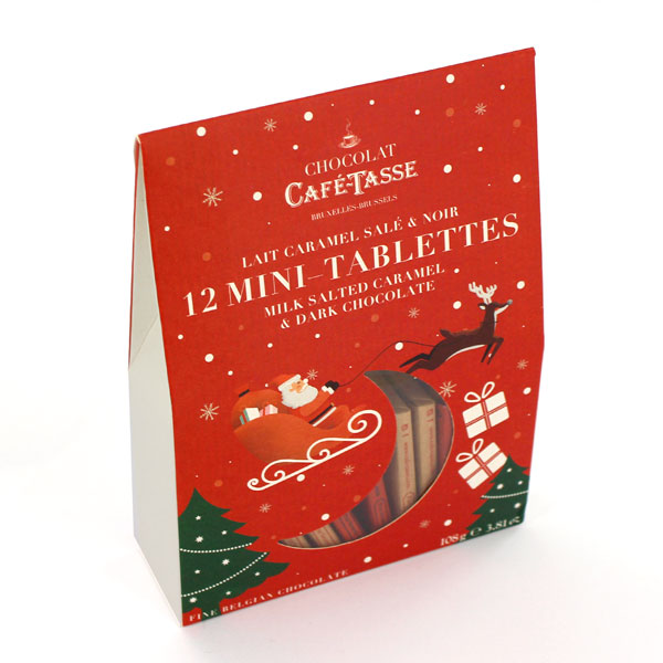 塩キャラメルミルクチョコと、カカオ60%のビターチョコを、 可愛らしいクリスマスボックスに詰め合わせしました。(各6枚、計12枚入り)