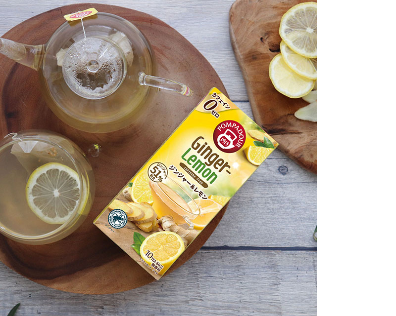 ポンパドールのジンジャー&レモンは、生姜を51%使用してスパイシーに仕上げました。レモンピールやリコリスをブレンドした人気のハーブティーです。ハチミツ・砂糖等を加えても、おいしく召し上がれます。