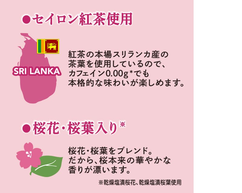 セイロン紅茶に、桜花や桜葉をブレンドし、桜本来の華やかな香りが漂うフレーバーティー。桜で彩られる春のような味わいを、お楽しみいただけます。 紅茶の本場スリランカ産の茶葉を使用しているので、カフェイン0.00gでも本格的な味わいです。夜でも気にせずティータイムを楽しみたい方、カフェインを控えている方やお子様にも。