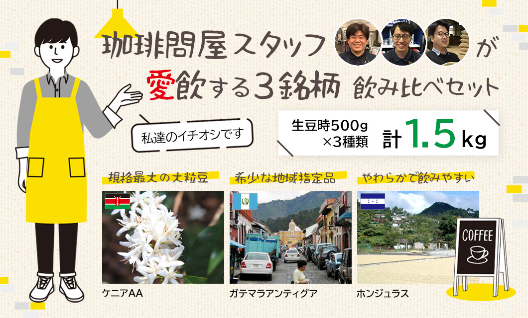 アフリカ特有の香りと力強いコクが特徴の「ケニアAA」、苦手な方をも魅了する綺麗な酸味をもつ「ガテマラアンディグア」、やわらかで飲みやすい「ホンジュラス」。 毎日飲んでも飽きのこない豊かな3つの個性派コーヒー、合計1.5kgのセットです。