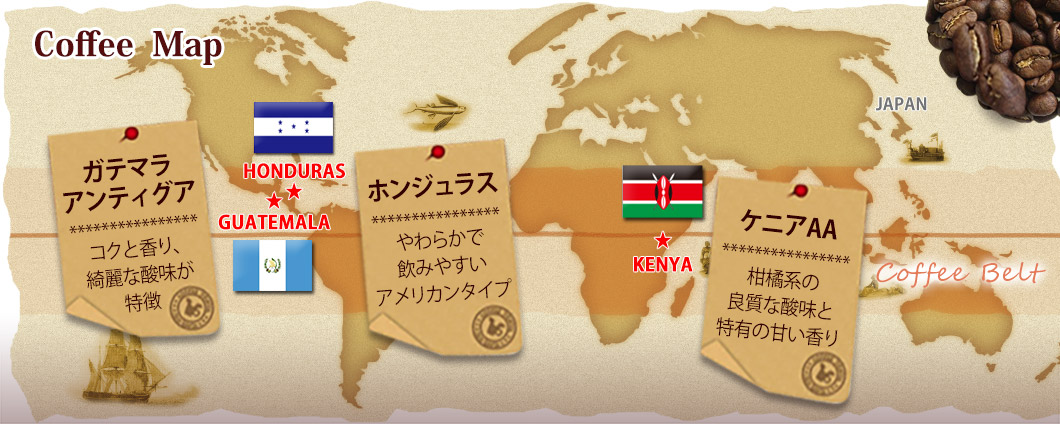 アフリカ特有の香りと力強いコクが特徴の「ケニアAA」、苦手な方をも魅了する綺麗な酸味をもつ「ガテマラアンディグア」、やわらかで飲みやすい「ホンジュラス」。