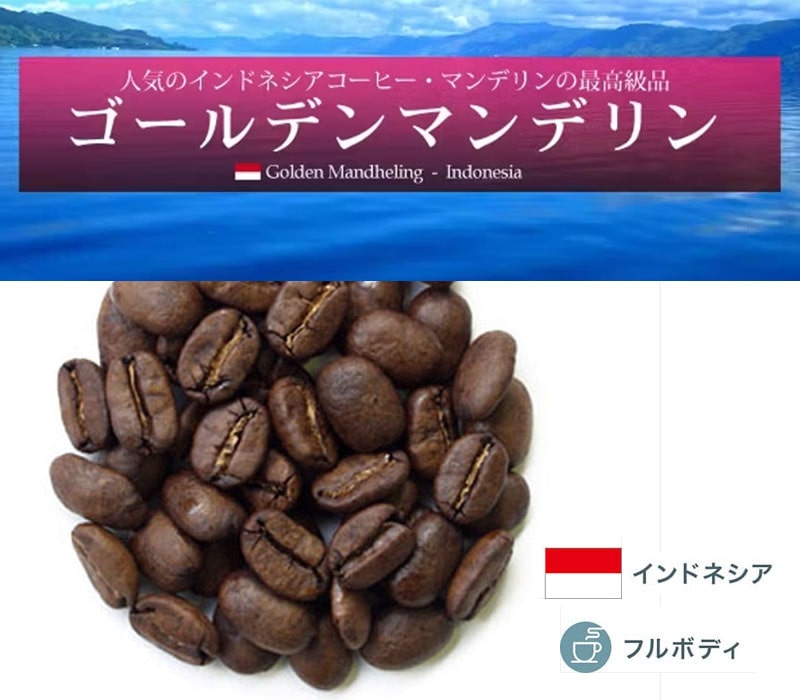 人気の生産国「インドネシア」。その中でもとりわけ人気の銘柄が「マンデリン」です。 スマトラ島北部で生産されるマンデリンの中でも大粒なものだけを選別したゴールデンマンデリン。 インドネシア・高地産特有の酸味の少ない上品な味わいとコクをぜひお楽しみ下さい。