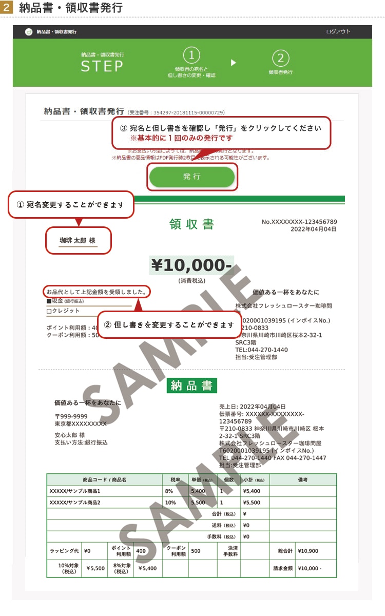 ご利用可能期間:ご注文品発送翌日から1年以内、領収書の発行は1回限りです。