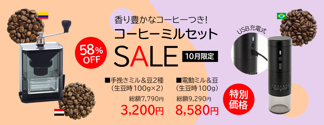 10月はコーヒーミルと香りに定評のある豆を組み合わせたお得なセットをご用意しました☆ 挽くときに立ち上がる豊かな香りも楽しみながらコーヒーシーズンをスタートさせましょう♪