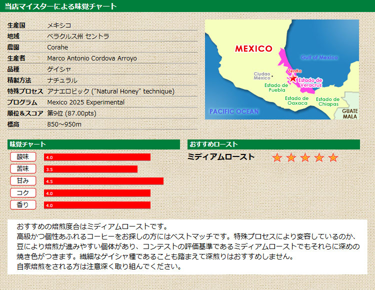 最高の中の最高のコーヒーを選ぶ「カップ・オブ・エクセレンス 2025 メキシコ」に見事に選ばれたコーヒーが届きました! Experimental(実験的)部門で第9位に入賞の「コラヘ農園」による、甘さと芳醇な後味が効いた、当店が扱ってきたCOEの中でも屈指の個性派コーヒーです。