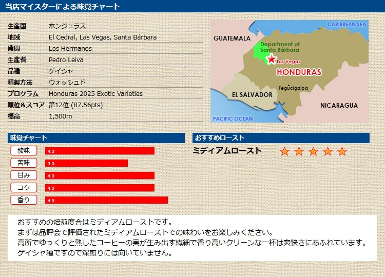 近年では、ハニープロセスや嫌気性発酵など、多彩な精製方法に挑戦し、味わいの幅を広げています。2025年のカップ・オブ・エクセレンスではゲイシャ種・水洗式精製のロットでエントリー。見事に87.56ポイントという高得点を獲得して入賞を果たし、国際的な評価を得ました。