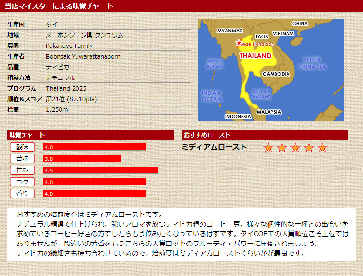 おすすめの焙煎度合はミディアムローストです。 ナチュラル精選で仕上げられ、強いアロマを放つティピカ種のコーヒー豆。様々な個性的な一杯との出会いを求めているコーヒー好きの方でしたらもう飲みたくなっているはずです。 タイCOEでの入賞順位こそ上位ではありませんが、段違いの芳香をもつこちらの入賞ロットのフルーティ・パワーに圧倒されましょう。ティピカの繊細さも持ち合わせているので、焙煎度はミディアムローストぐらいがが最良です。