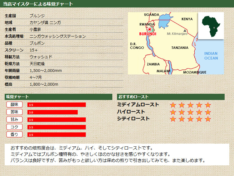 ニンガ地区の小農家さんが丁寧に栽培したブルボン種による『 ブルンジ ニンガ 』の、まろやかで気品のあるやさしい一杯をぜひお楽しみください。