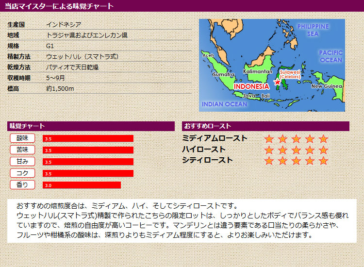大地を感じるアーシーな味わいに、スラウェシ産らしい透明感のあるすっきりした酸質とやさしい甘さの一杯をぜひお楽しみください。