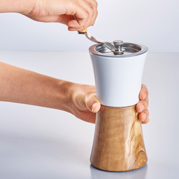 セラミック製ホッパーと上質で手になじむオリーブウッドの粉受けの組み合わせが使わない時でも飾っておきたいコーヒーミルです。