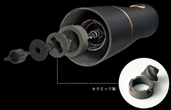 円錐状の刃が回転してコーヒー豆を挽く臼式を採用し、挽き目の調整が容易で、粒度のバラつきが少なく挽くことが可能です。セラミック製の刃にすることで手間なく簡単にお手入れができます。劣化せず錆びることがなく、水洗いが可能なため、お手入れの手間が軽減されます。