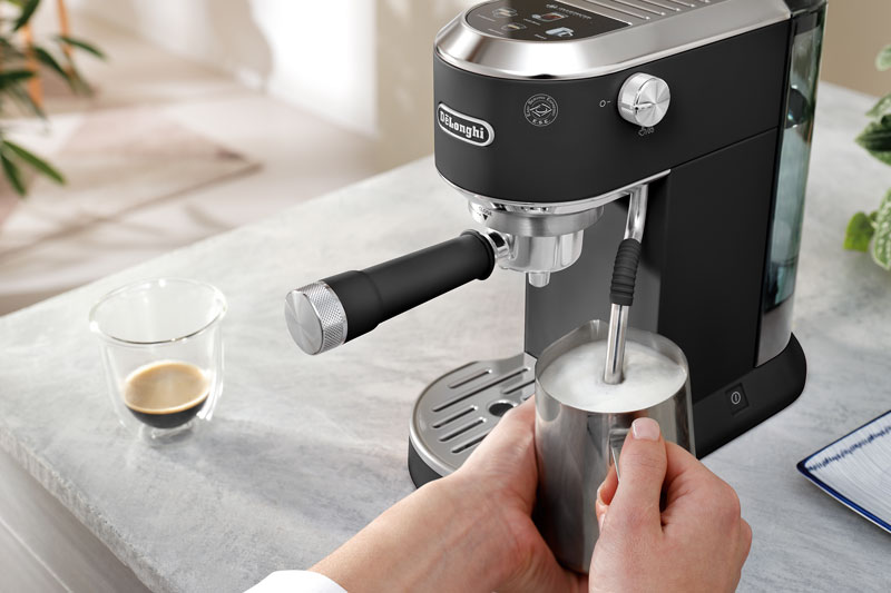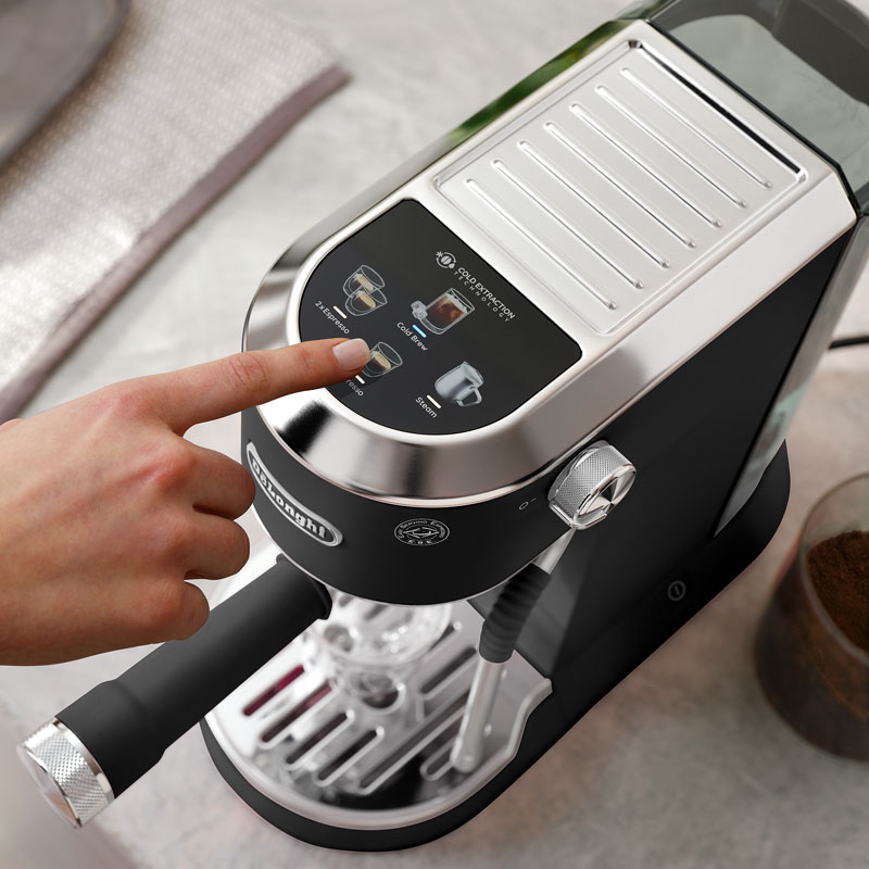 デロンギのスリムなポンプ式抽出のエスプレッソメーカー「デディカ デュオ」は、自分の手でお店のようなコーヒーを淹れる愉しみ、ラテアートを魅せる悦びをおうちで叶えるエスプレッソ・カプチーノメーカーです。 抽出やスチームを手動で調整できるため、エスプレッソはもちろん、ミルクの質感を自分好みに整えてカフェラテなどのミルクメニューを仕上げ、ラテアートまで愉しめるのが特長です。さらに、ホットだけでなく、コールドブリューまで選択肢も広がり、季節や気分に合わせた「バリスタ体験」を一年を通してお愉しみいただけます。