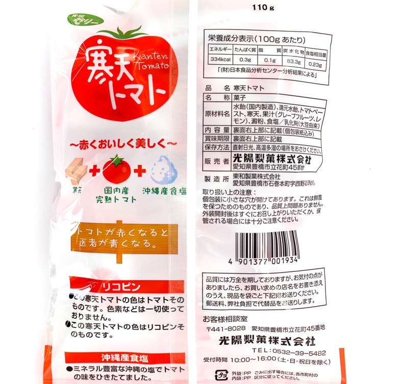 原材料名:水飴(国内製造)、還元水飴、トマトペースト、寒天、果汁(グレープフルーツ、レモン)、澱粉、食塩/乳化剤(大豆由来)