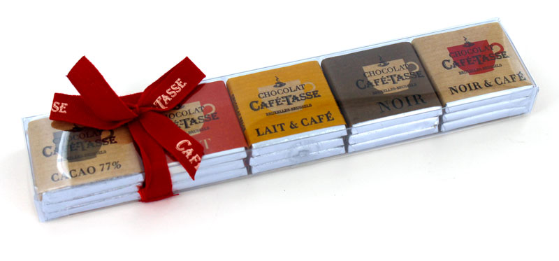 1989年に設立の Caf-tasse (カフェタッセ) は、フランス語でコーヒーカップを意味し、その名の通りコーヒーとのフィーリングを追求したチョコレートです。 アフリカ、南アメリカの選りすぐりのカカオ豆をブレンドして作られたチョコレートは、豊かなカカオの香りと濃厚でコクのある味わいが特徴です。ベルギーの代表的なチョコレートメーカーのひとつとしてヨーロッパ、アメリカ、アジアの40カ国ものチョコレートグルメたちに愛されています。