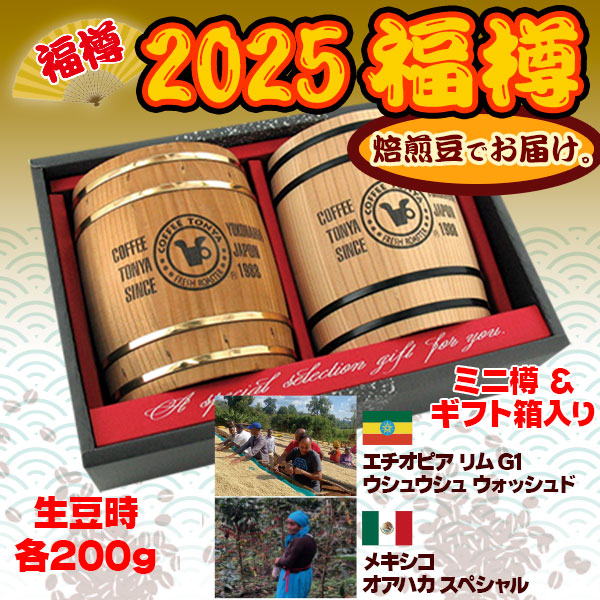 【2025年 新春初売り!!】 福樽セット 生豆時200g×2種 焙煎豆のまま おしゃれなミニ樽入りギフトセット