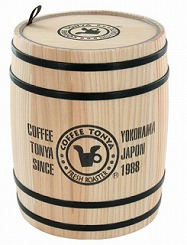 珈琲問屋のロゴが入ったかわいらしいミニ木樽! こちらは白木にブラックのラインが入ったタイプです。
