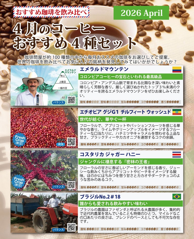 【メール便・配達日時指定不可】 4月のおすすめ豆4種類お試しコーヒーメール便 (4袋セット/珈琲解説付き)2026年