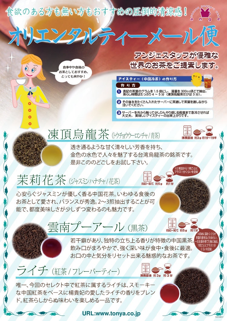 当店オリジナルティーブランド・アンジェからその季節におすすめの茶葉をピックアップし、 A4ファイルケースに詰めてメール便でお届けします。