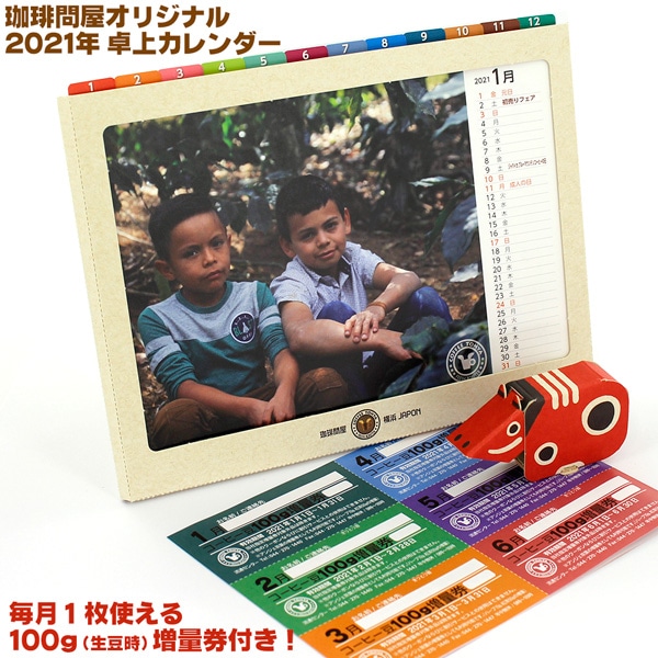 こちらの卓上カレンダーには毎月1枚、コーヒー豆100g(生豆時)購入して100g(生豆時)増量できるチケットが 12ヶ月(毎月締め切り)分付いていますので、増量券を使えば使うほど大変お得なカレンダーです。